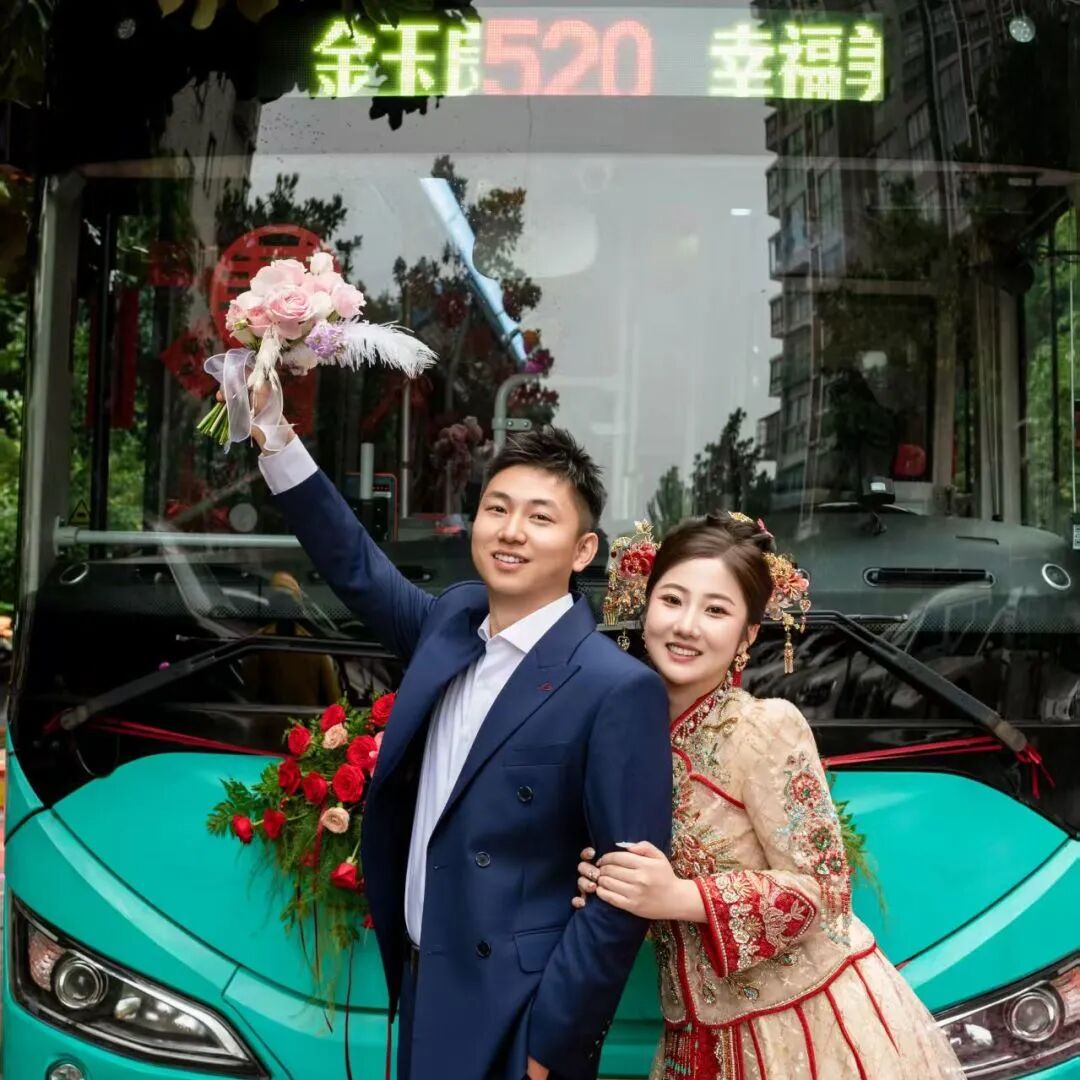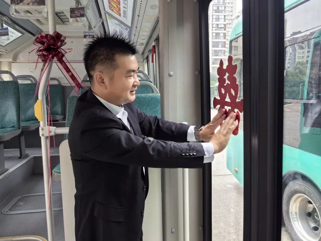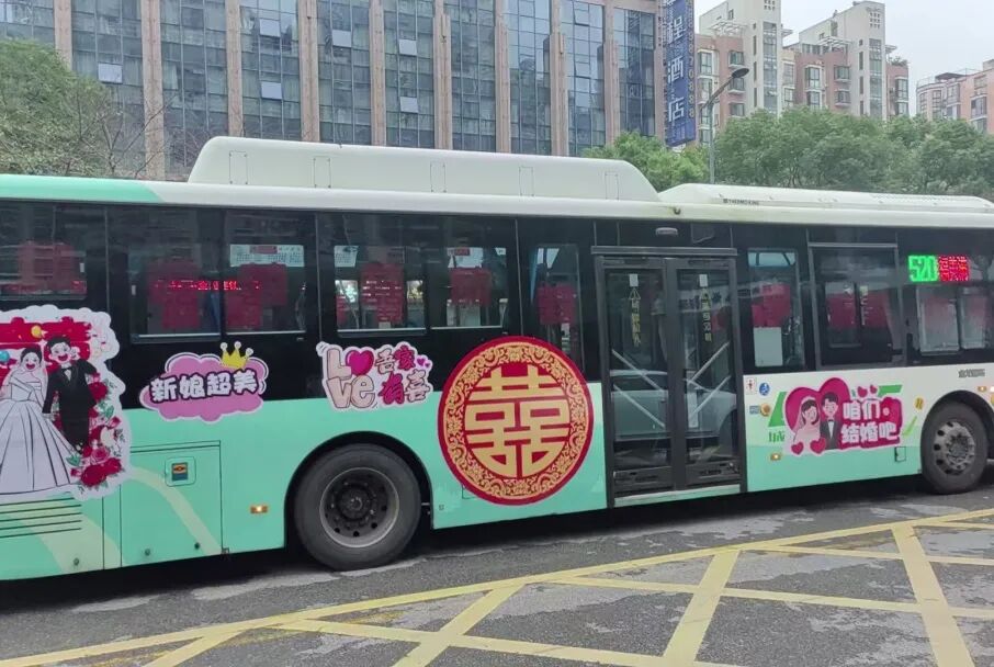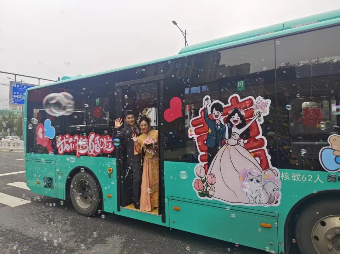 同一天,家住荷塘月色的柏先生也选择了公交婚车迎娶新娘。他们的婚车张贴着新人卡通形象,车窗点缀红双喜,车厢内摆放亲友手写祝福卡和五彩气球,温馨又喜庆。柏先生认为:“公交婚车很新颖,接亲途中能和亲友一路欢歌笑语,很多行人看到了也会驻足拍照,氛围感更强。”新娘感动地说:“这样的婚礼既环保又独特,会成为生命中最珍贵的回忆。”