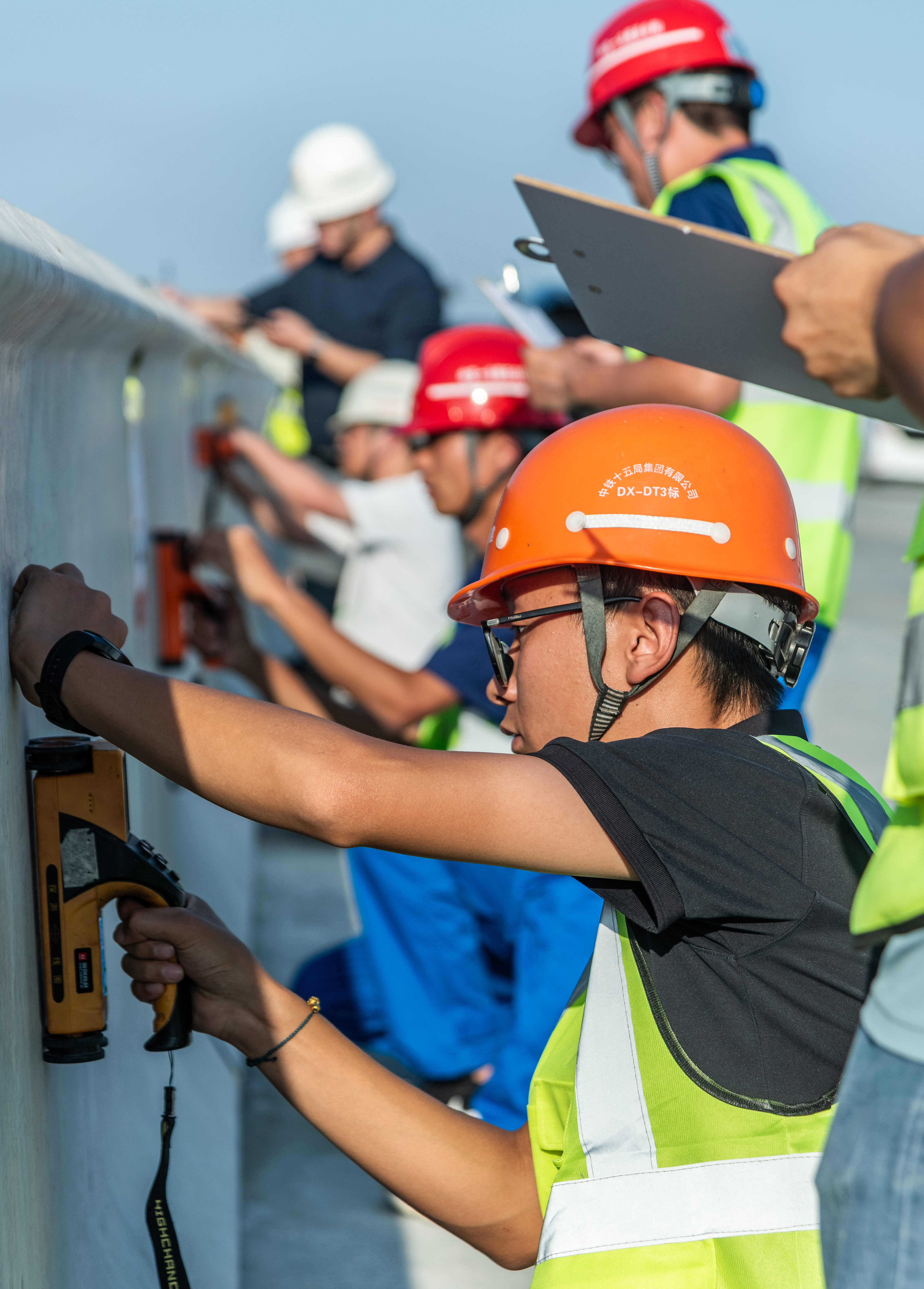 在紧锣密鼓推进实体工程的同时,一场别开生面的“试验检测技术竞赛”也在工地上演。这不是一场简单的比武,而是对工程“质量卫士”专业能力的一次检阅。参赛者全神贯注,按照竞赛要求抽签排号,进行桥梁护栏钢筋保护层厚度检测,经过激烈角逐,最后决出前6名。组织竞赛的市交建中心工会和质安中心负责人表示,组织这次竞赛,目的就是为大家提供一个相互切磋、共同提高的机会,以赛促学、以学促干,激发全体检测人员钻业务、练技能、保质量的热忱,为打造“品质工程”筑牢基础。