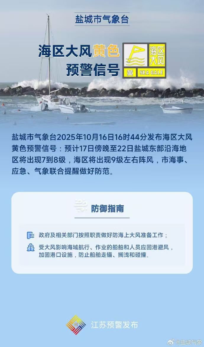 受冷空气持续影响,10月17日傍晚至22日,盐城东部沿海将出现7—8级大风,近海海区阵风可达9级。为保障海上交通安全,应对好此次冷空气影响,盐城海事局与盐城市气象局首次联合发布盐城海区大风黄色预警,明确提示受影响海域船舶及时采取避风、加固等防范措施,全力保障人员与船舶安全。