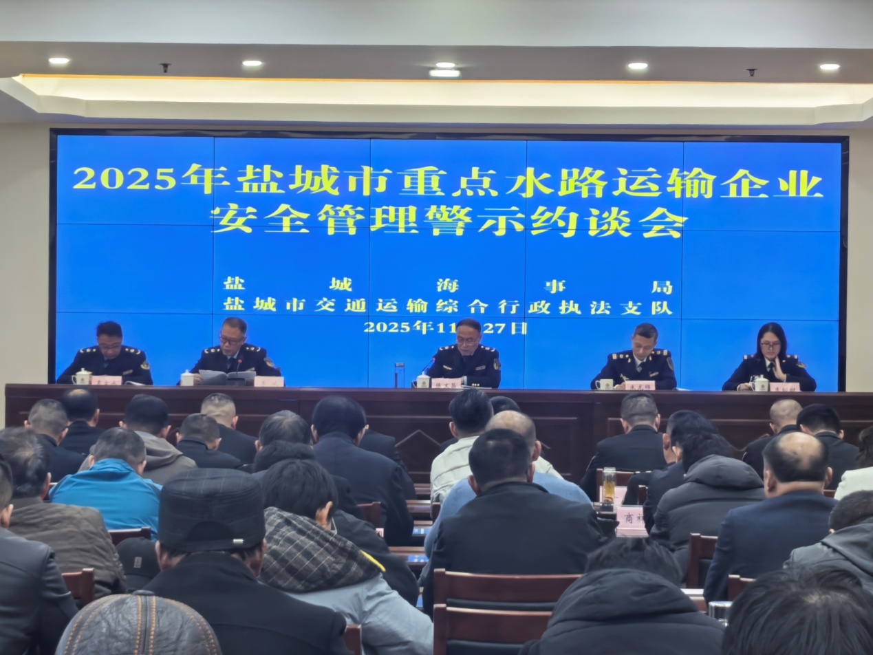 为对照交通运输部海事局新发布的《航运企业落实安全生产主体责任指南(1.0)》,部署今冬明春及2026年元旦、春运等重点时段安全生产工作,部署企业开展"除险保安"冬季行动,11月27日,盐城市交通运输综合行政执法支队和盐城海事局联合召开2025年度重点水运企业安全警示约谈会,对全市重点水运企业主要负责人和专职安全管理人员进行约谈提醒,压紧压实企业主体责任,严守安全底线,筑牢水上交通安全防线,坚决防范重特大事故,保障全市水上交通安全形势稳定。