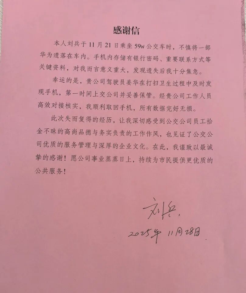 无独有偶,11月21日,59路公交驾驶员姜华也在车厢内拾获一部手机,通过工作人员多方联系,最终将手机完好归还给失主刘兵。