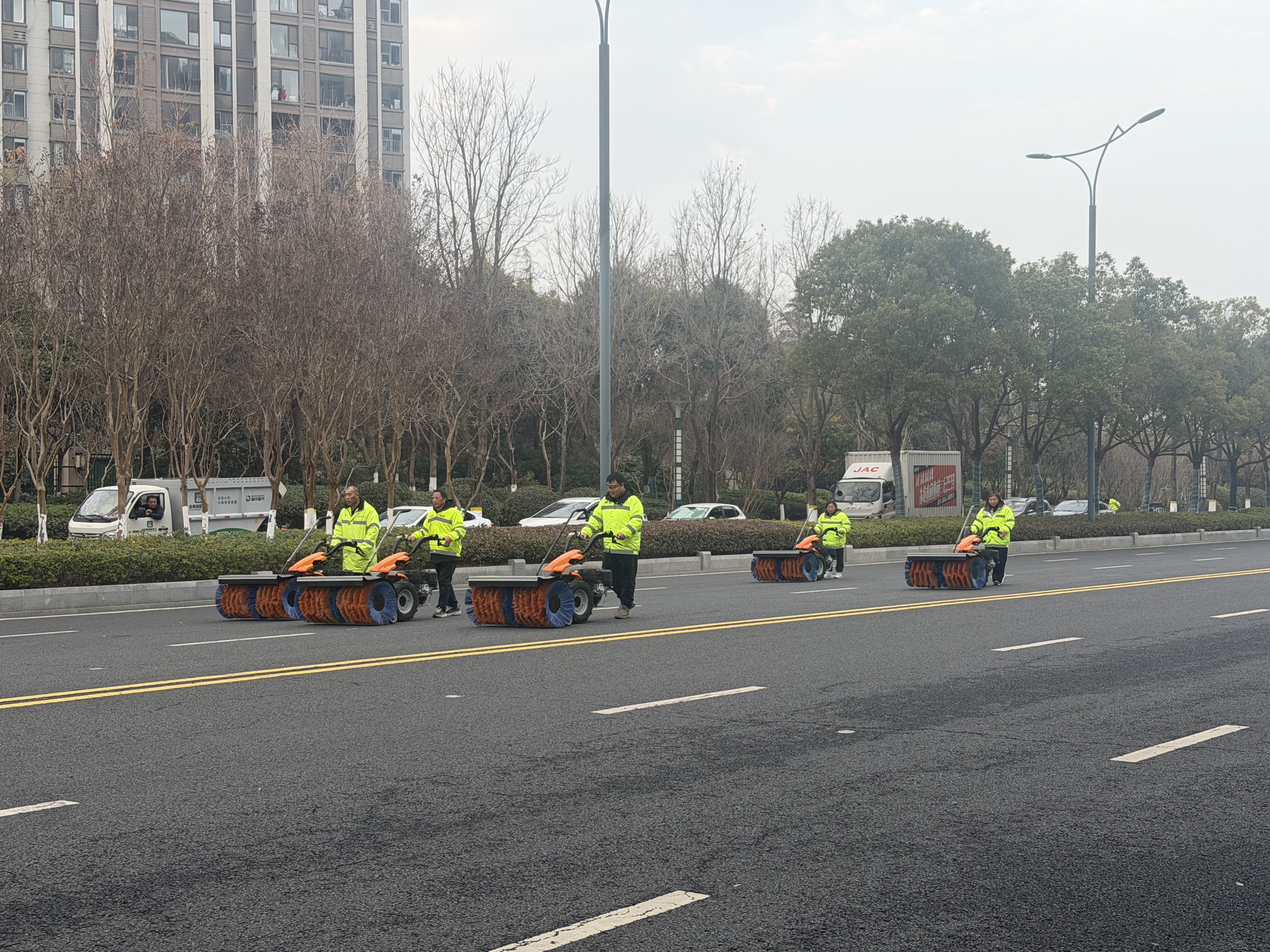 “扫雪除冰,演练开始!”随着指挥人员指令下达,演练正式启动。大型扫雪车严格按照冬季实战标准呈斜线排列,沿同一方向有序开展作业——先通过滚雪刷模拟清扫道路表层浮雪,再借助前置推雪板将“模拟积雪”推向道路两侧,完整还原真实降雪后的车道清障流程。与此同时,小型扫雪机并行实操,作业人员人工推行完成积雪归集后,按实战流程开展统一清运演练,各环节衔接顺畅、高效有序。