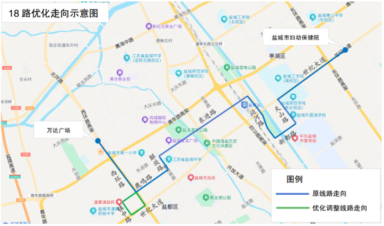 优化后走向:万达广场、西环路、鹿鸣路、镇中路、世纪大道、西环路、鹿鸣路、解放路、东进路、运河路、新都路、天山路、世纪大道、盐城市妇幼保健院。
