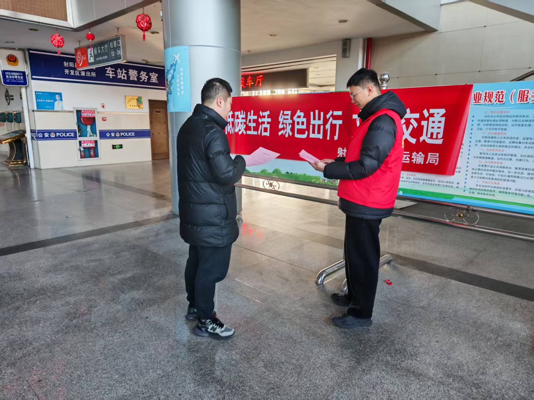 在射阳县客运站这一交通枢纽,工作人员提前在站内显眼位置悬挂起了宣传横幅。“低碳生活、绿色出行、文明交通”这一醒目的标语,吸引了过往旅客的目光,为活动营造了浓厚的宣传氛围。