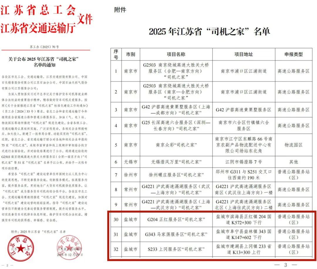 近日,2025年全国服务区“司机之家”评定结果正式发布,盐城交投集团运营的G204正红、G343马家荡、S233上冈3座服务区荣获全国服务区“司机之家”品牌称号。至此,该集团负责运营的16座国省道公路服务区均已通过交通运输部“司机之家”达标评定,实现服务区“司机之家”全覆盖,总数量、覆盖率及综合服务水平继续位居全省前列。