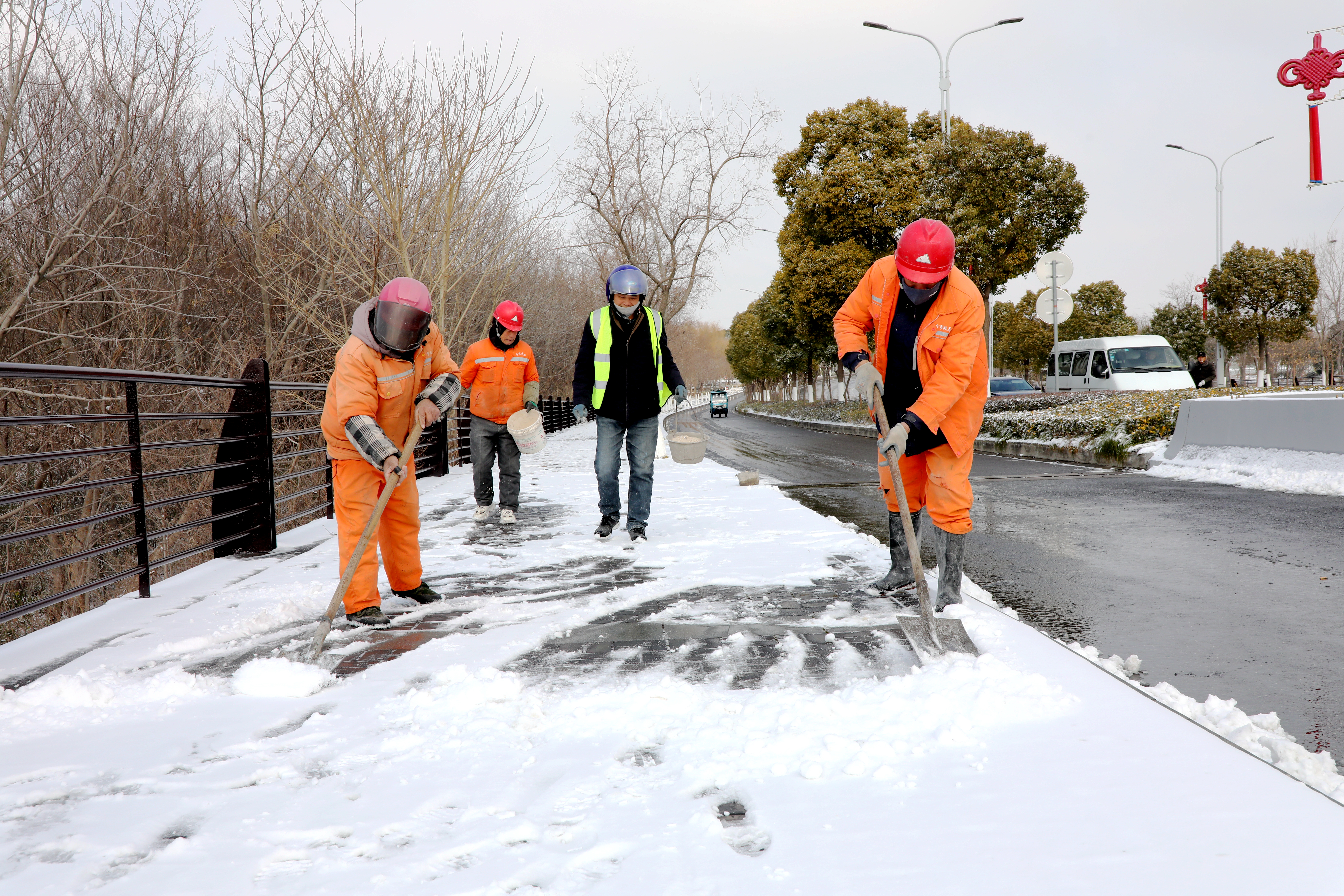 风雪之中,温暖守护也在同步进行。清晨6点半,东台市人民公园18名养护人员已冒着严寒,手持除雪铲、扫帚等工具,齐心协力铲除路面、亭桥等处积雪和暗冰。经过三小时连续奋战,上午九点半左右,公园主干道及重点区域积雪基本清除完毕,及时恢复了安全通畅的游览环境。