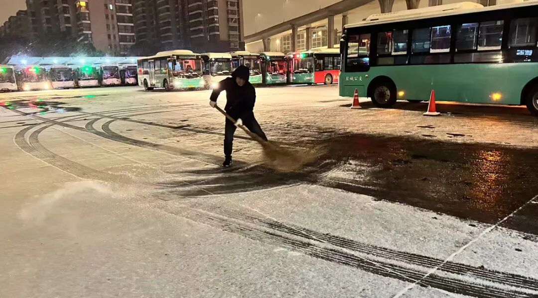 雪花飘落伊始,公交公司便迅速进入应急状态。79名管理人员率先奔赴各场站、重点路段,手持工具清扫积雪,有序撒布融雪剂,从源头降低路面结冰风险。