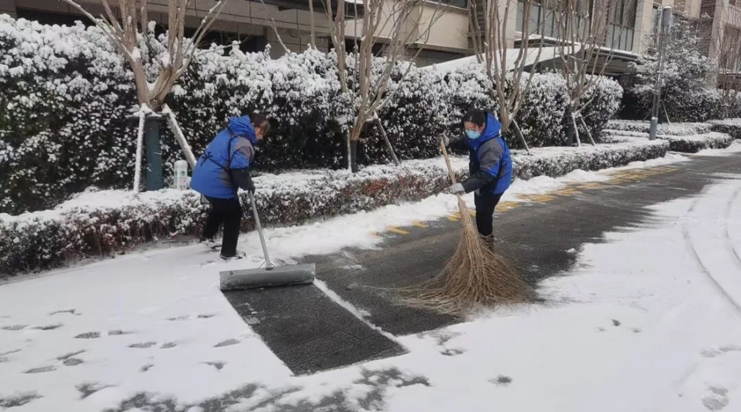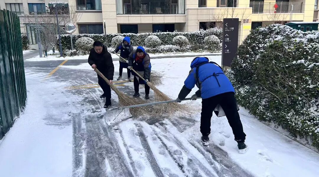 天还未亮,物业工作人员就顶着凛冽寒风投入战斗,优先清理小区主干道、单元门出入口、车库坡道等关键区域。玖玺台小区内,工作人员弯腰挥铲、合力清扫;锦瑞学府里,除雪队伍分工协作,奋力推雪开路。雪花凝结在他们的衣帽上,寒风冻红了双手,但没人停下脚步,只为确保业主出门前就能踏上“安心路”。