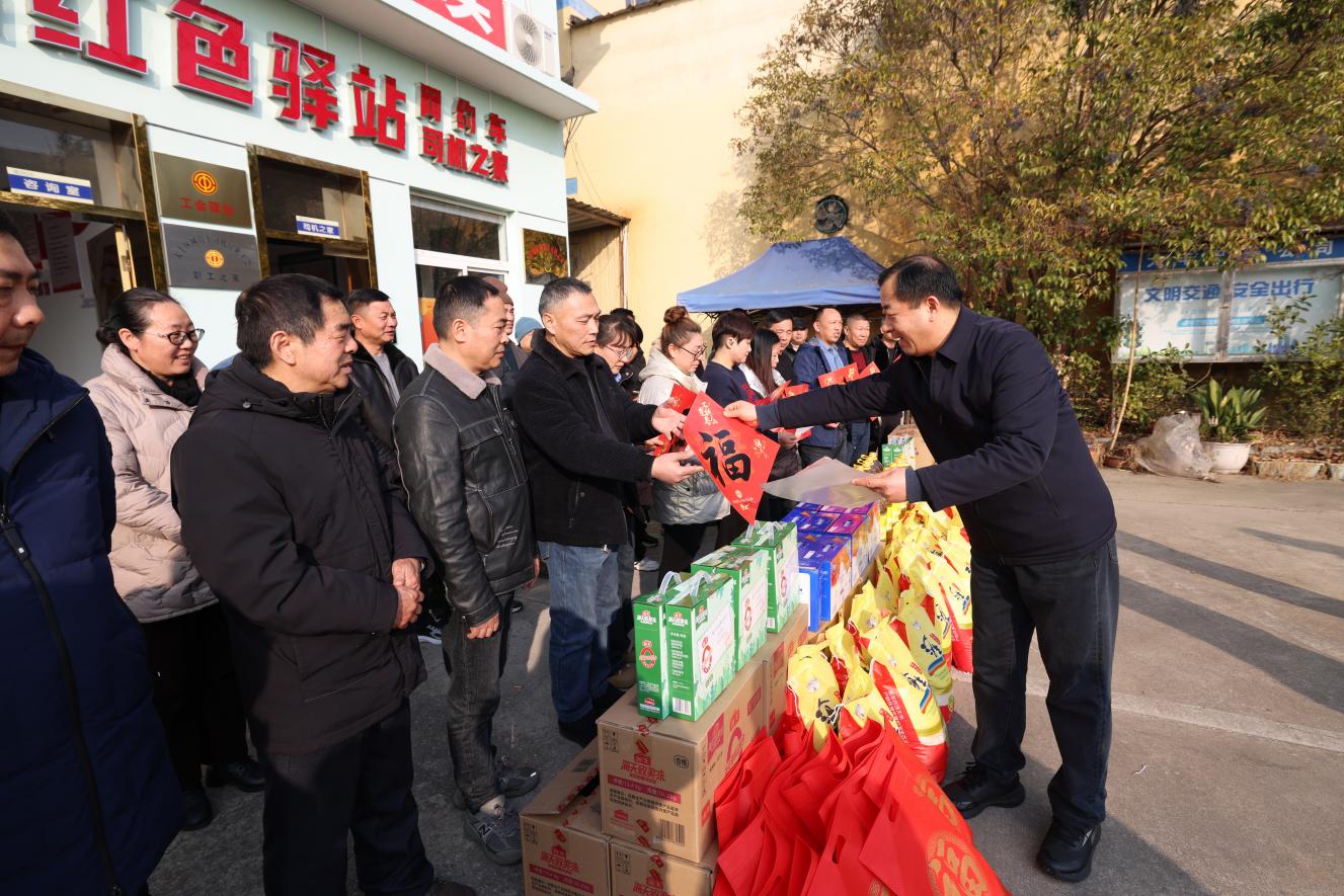 大丰区总工会副主席杨爱斌与大丰区运输事业发展中心副主任肖红屯一同为司机代表们发放了精心准备的“新春温暖礼包”。礼包内不仅包含了大米、食用油、酸奶、调味品等实用物资,还特别准备了春联、福字等节日装饰品,年味浓厚、关怀备至。肖红屯主任结合春运期间交通安全形势,现场进行了温馨提示,嘱咐司机朋友增强安全意识,做好车辆日常维护,确保节日期间运营安全。