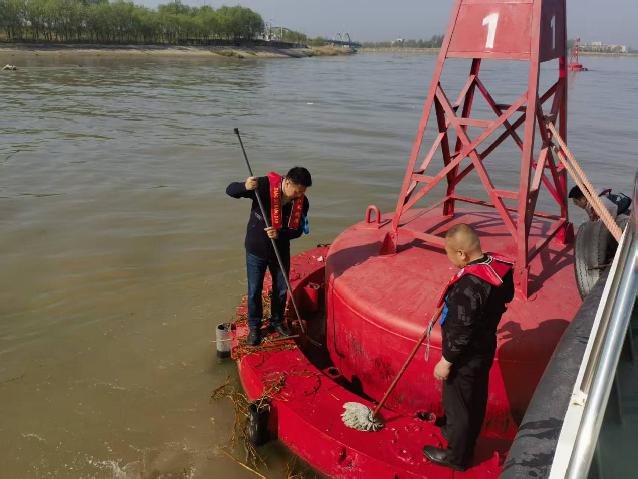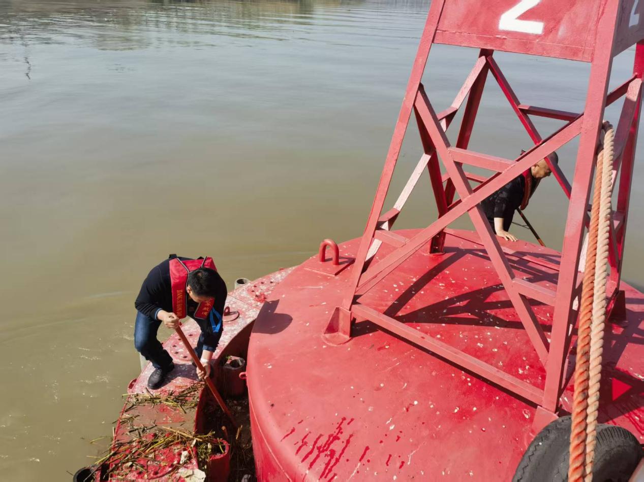 在灌河县城段巡查中,巡查组发现部分侧面浮标浮箱内侧积聚大量春季漂浮物。工程养护科科长成斐立即组织党员先锋队展开清理作业。“隐患不等人,安全不过夜!”队员们手持钩刀、捞网等工具,在浮动平台上细致清理缠绕在浮标结构中的水草、树枝及生活垃圾。经过连续作业,累计清除浮杂物约0.5吨,并对所有清理后的航标进行彻底清洗和功能检测,确保航标视觉效能与导航功能全面达标。