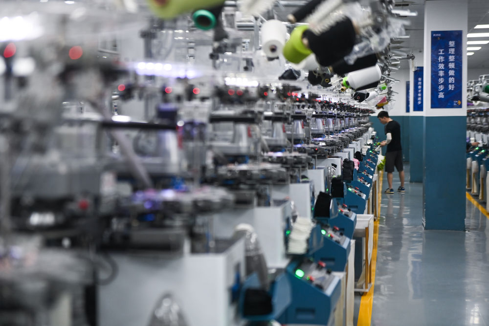 5月25日,在位于浙江省诸暨市大唐街道的浙江凯诗利科技有限公司的数字化车间内,工作人员在查看织缝翻检智能一体袜机的运行情况。新华社记者 徐昱 摄