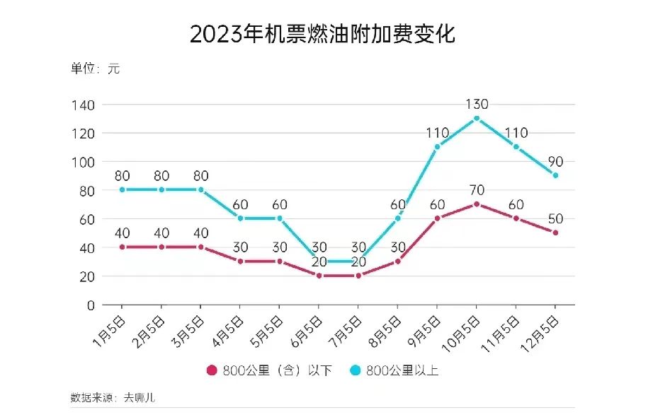 12月1日,“去哪儿”接到航空公司消息,自2023年12月5日(出票日期)起,成人旅客:800公里(含)以下航线每位旅客收取50元燃油附加费,800公里以上航线每位旅客收取90元燃油附加费。相较于调整前分别降低了10元和20元。
