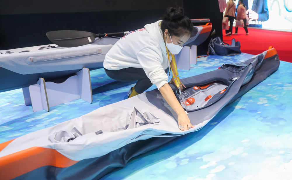 2020年11月6日,在第三届进博会迪卡侬展台,工作人员进行可折叠皮划艇的安装演示。新华社记者 丁汀 摄
