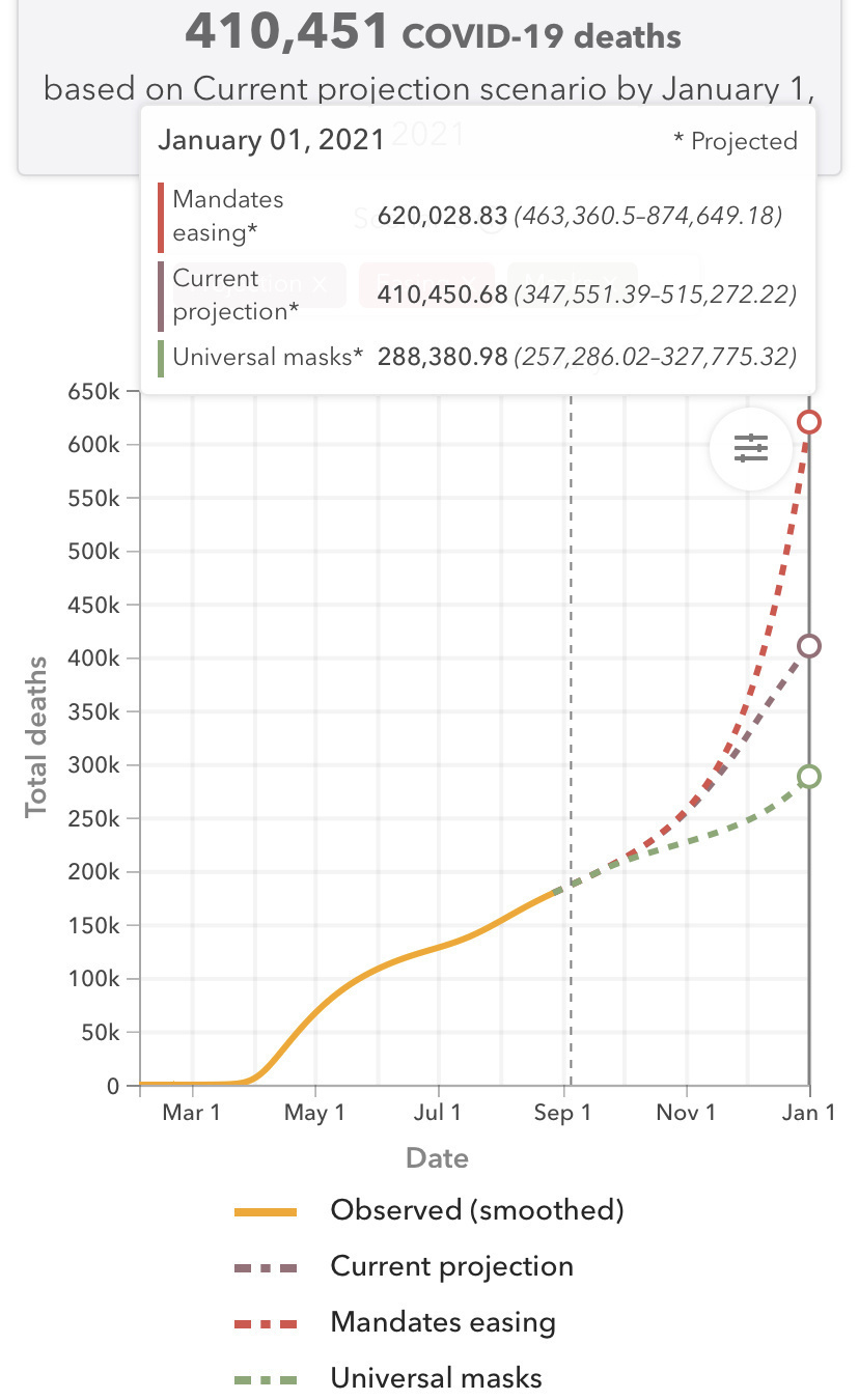 该报告基于不同的前提条件提出了三种可能性:截至2021年1月1日,如果政府收紧防疫政策,美国新冠肺炎的死亡病例将近30万例,达288380例;如果维持当前的政策,死亡病例将增长超过一倍,累计达410450例;如果施行“群体免疫”,放松防疫政策,死亡病例数量将达到620028例的高值。