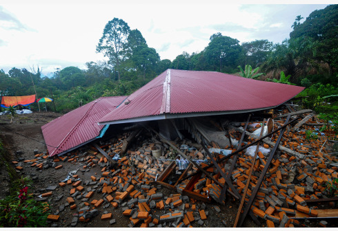 这是2月25日在印度尼西亚西苏门答腊省拍摄的在地震中受损的房屋。