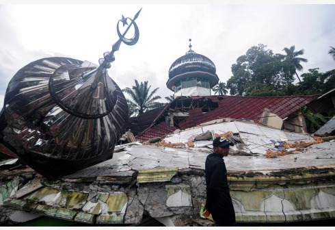 2月25日,在印度尼西亚西苏门答腊省,一名男子走过地震中受损的房屋。