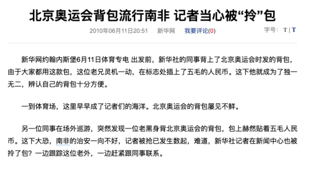 除此之外,新华网记者2010年世界杯期间去南非采访时也背着这款背包,到现场后发现,“北京奥运会的背包屡见不鲜”。