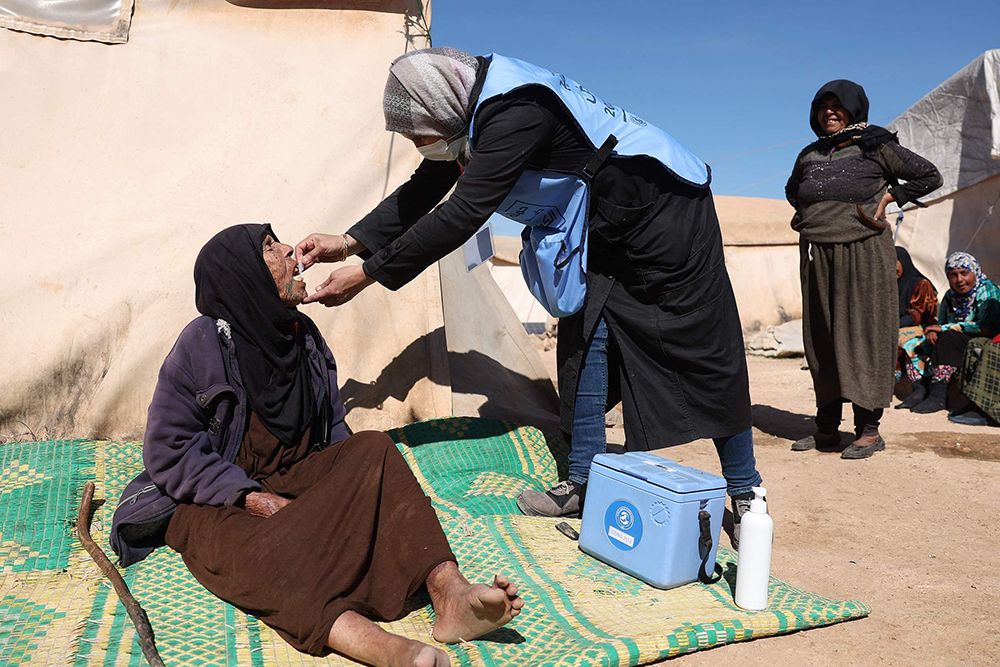 当地时间2023年3月7日,叙利亚马雷特米斯林镇,难民营内,医生在给一名女子接种霍乱疫苗。