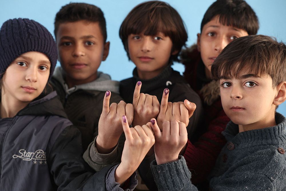 当地时间2023年3月7日,叙利亚马雷特米斯林镇,孩子们在接受霍乱疫苗接种后展示他们被墨水染红的手指。