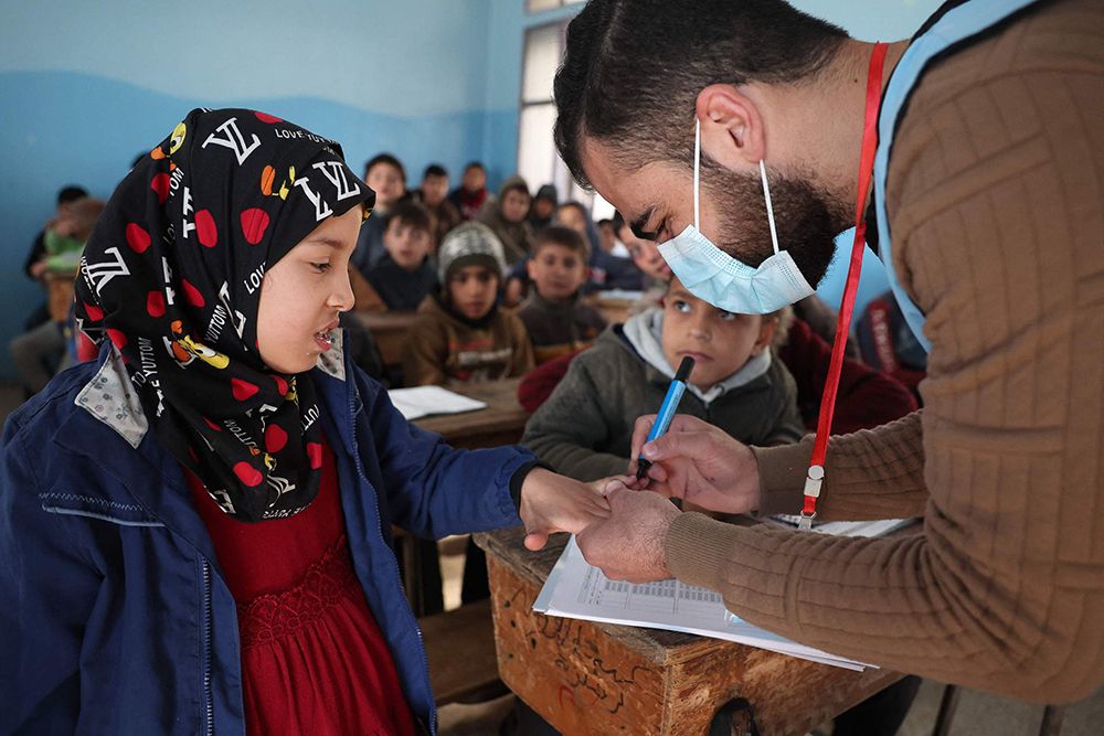 当地时间2023年3月7日,叙利亚马雷特米斯林镇,医生在给一名儿童接种霍乱疫苗。