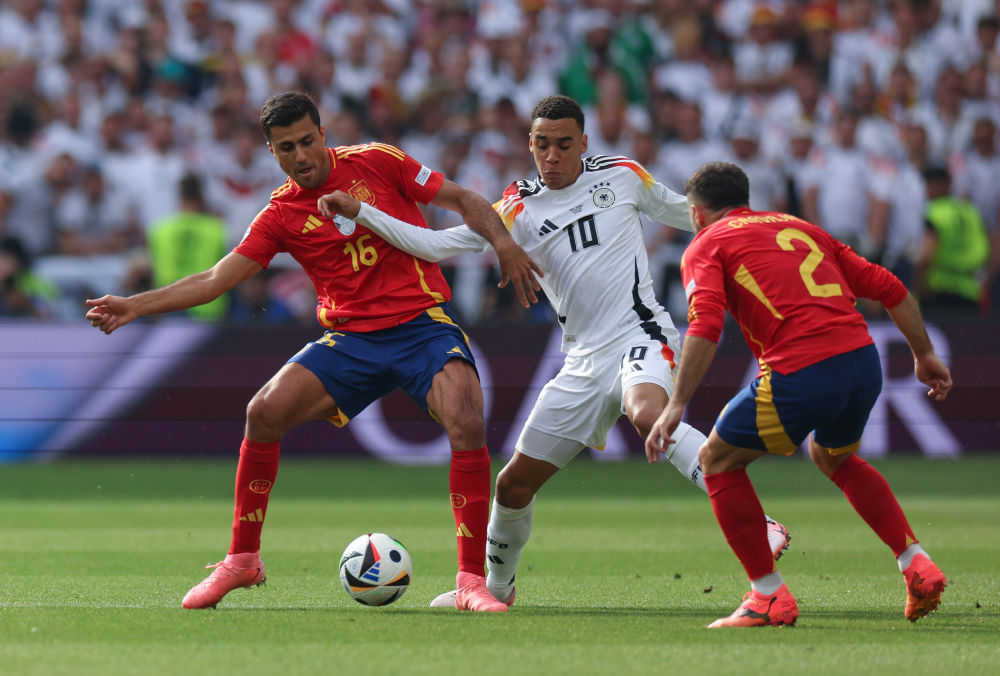 7月5日,德国队球员穆夏拉(中)与西班牙队球员罗德里(左)、西班牙队球员卡瓦哈尔在比赛中拼抢。当日,在德国斯图加特进行的2024年欧洲足球锦标赛四分之一决赛中,西班牙队2比1战胜德国队,晋级四强。新华社记者 白雪飞 摄