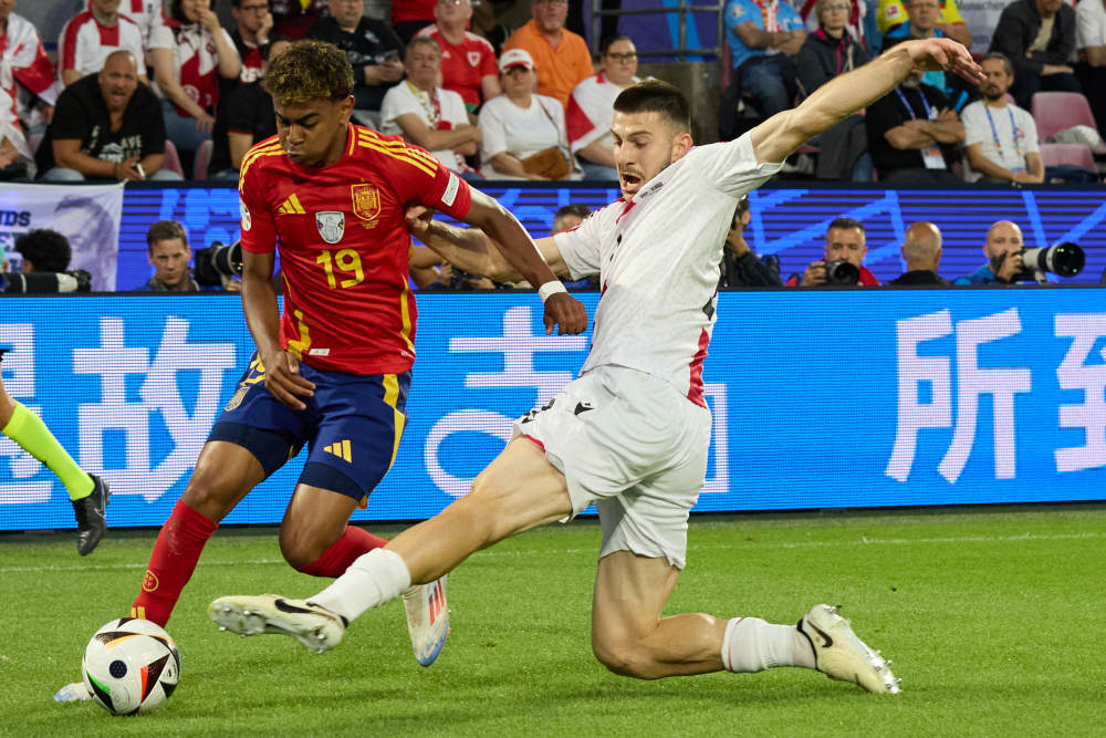6月30日,西班牙队球员拉明·亚马尔(左)与格鲁吉亚队球员卢卡·洛乔什维利在比赛中拼抢。当日,在德国科隆进行的2024年欧洲足球锦标赛八分之一决赛中,西班牙队4比1战胜格鲁吉亚队,晋级八强。新华社记者 孟鼎博 摄