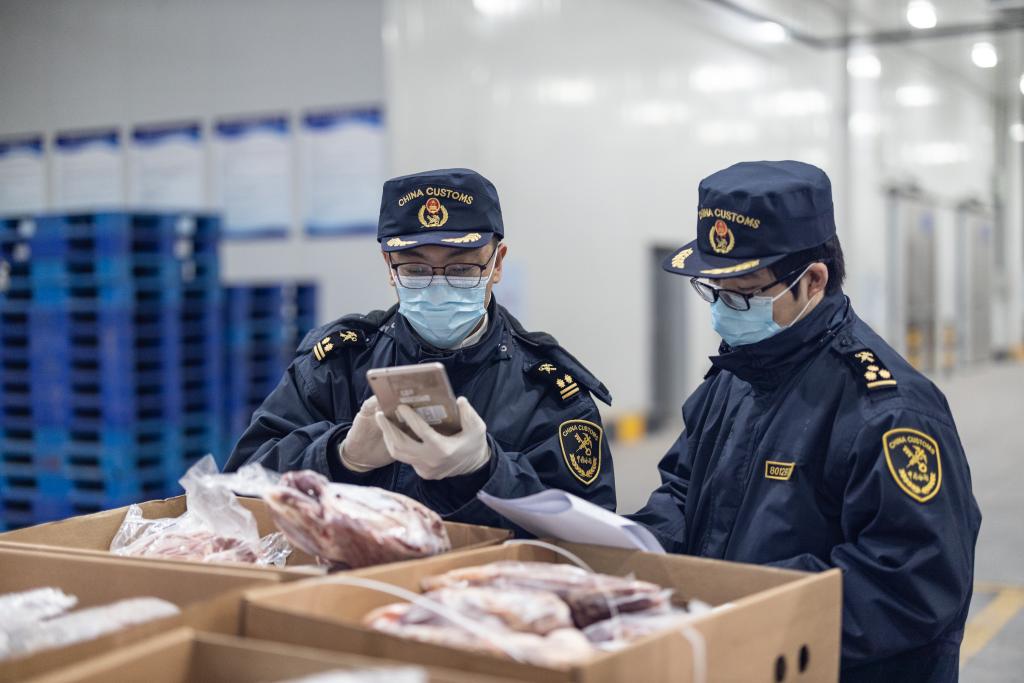 打开米白色的冷冻集装箱,重庆海关所属渝州海关监管科副科长刘议凡与同事正仔细查验一批来自欧洲的肉类。不久后它们将被送至川渝地区各大商超、火锅店。
