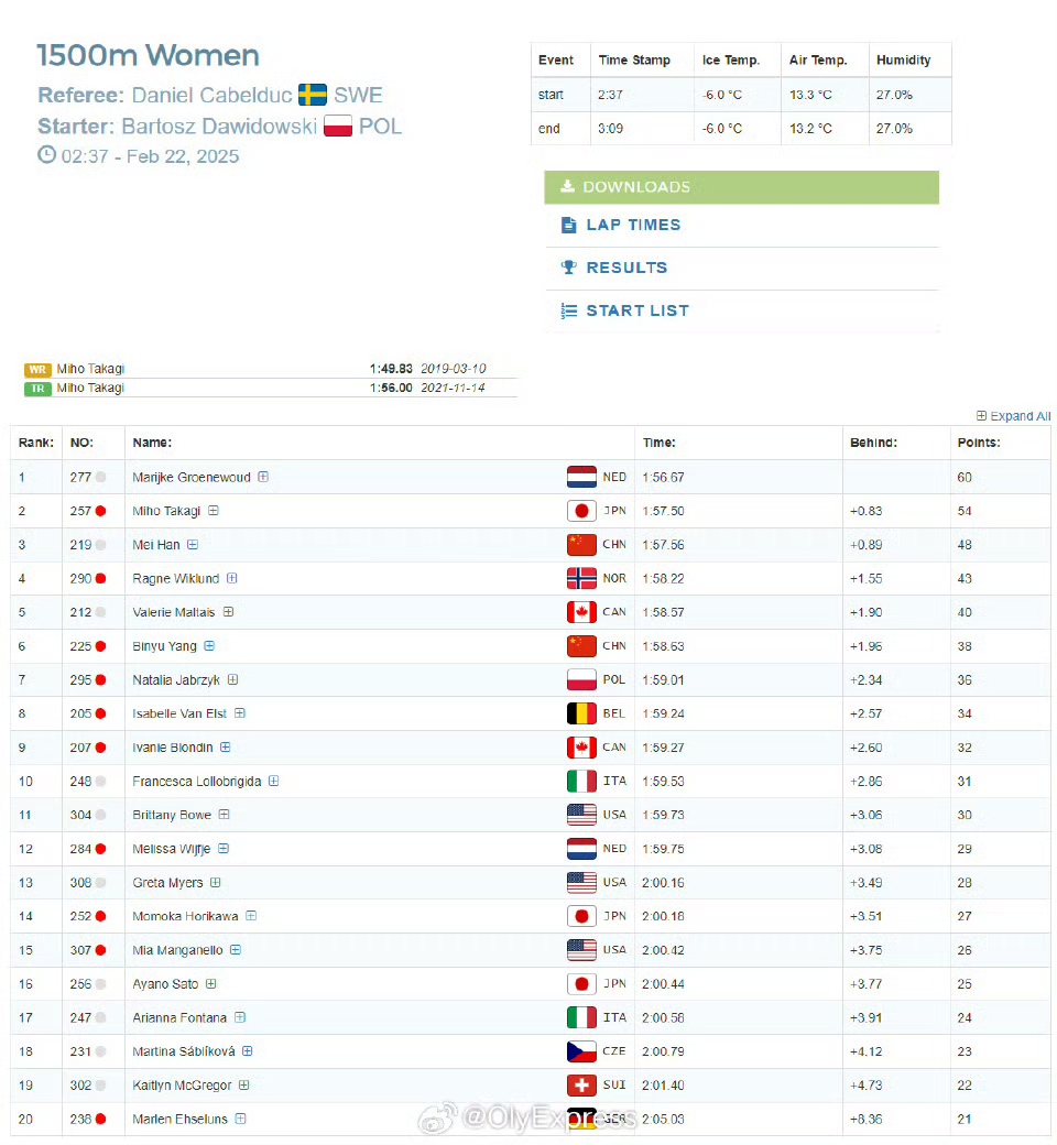 在女子1500米比赛中,荷兰选手格罗恩伍德以1分56秒67夺冠,日本名将高木美帆和中国选手韩梅分获亚军和季军,杨滨瑜排名第六。