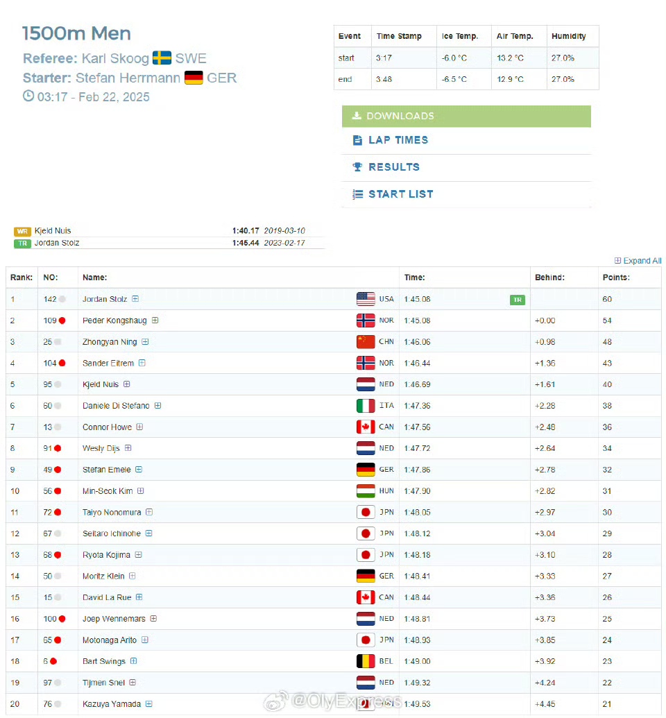 在男子1500米比赛中,美国选手斯托尔兹以1分45秒08夺冠,宁忠岩获得铜牌。