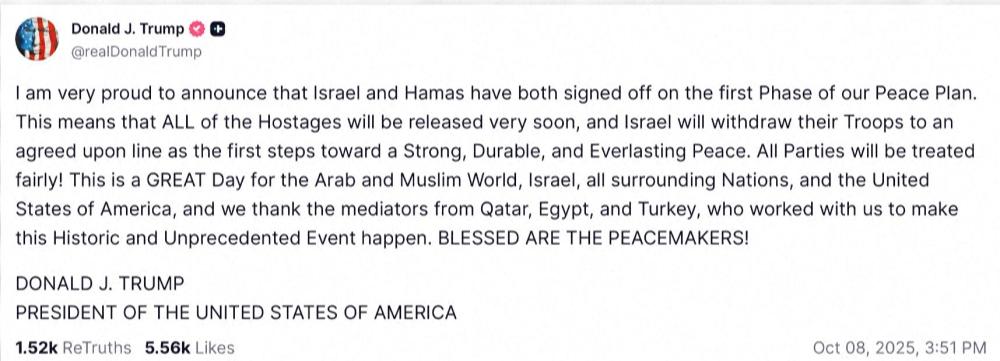 美国东部时间8日傍晚,美国总统特朗普在社交媒体发文宣布,以色列和巴勒斯坦伊斯兰抵抗运动(哈马斯)已经同意美方所提“和平计划”的第一阶段。这意味着所有以方被扣押人员将很快获释,以色列军队也将撤回至双方商定的界线。