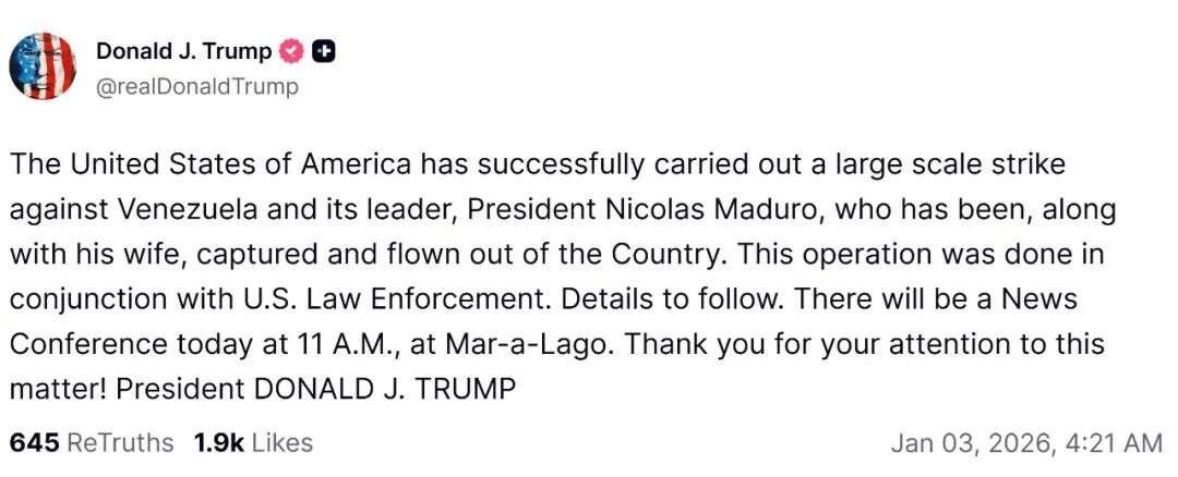特朗普当日表示,美方已成功对委内瑞拉实施打击,抓获委内瑞拉总统马杜罗及其夫人,并带离委内瑞拉。