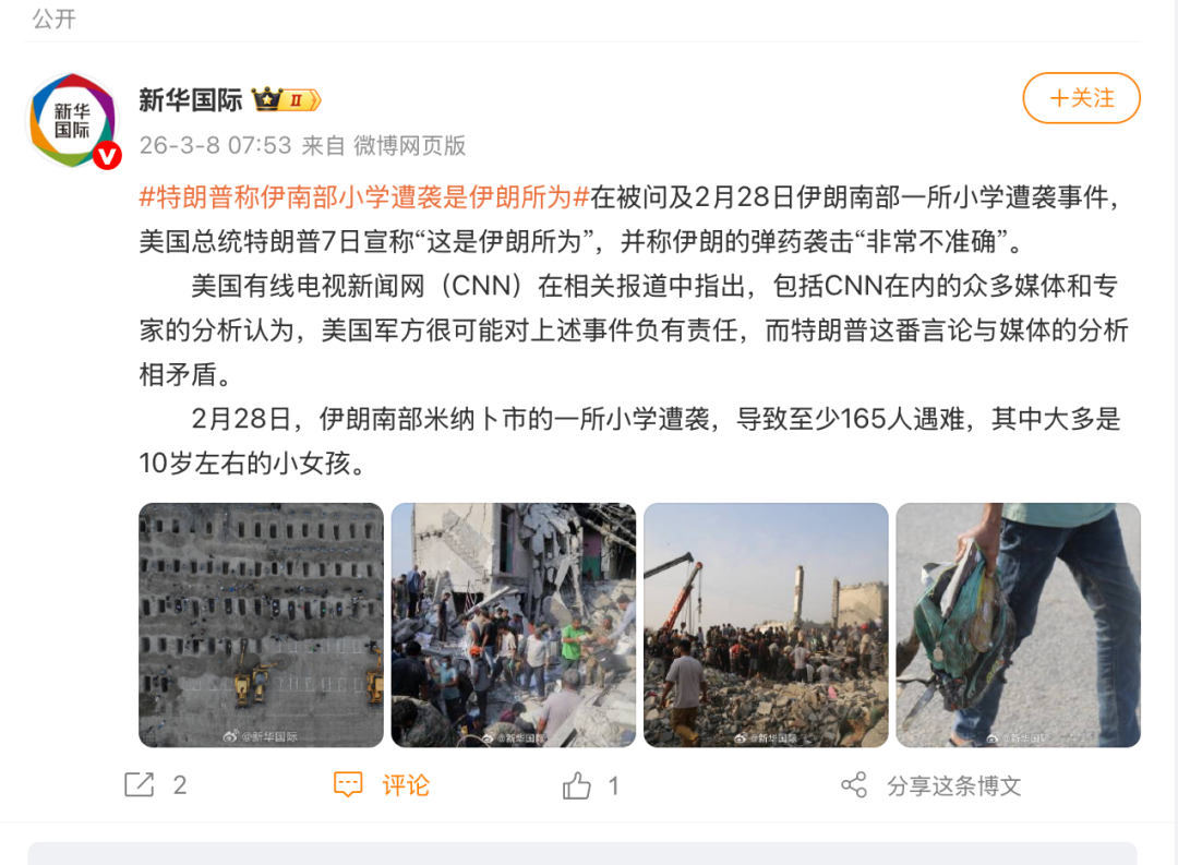 在被问及2月28日伊朗南部一所小学遭袭事件,美国总统特朗普7日宣称“这是伊朗所为”,并称伊朗的弹药袭击“非常不准确”。