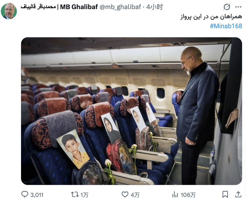伊朗首席谈判代表、伊朗议会议长卡利巴夫当天在自己的社交媒体账号发了一张让人动容的照片,配文“我的飞行同伴们”。