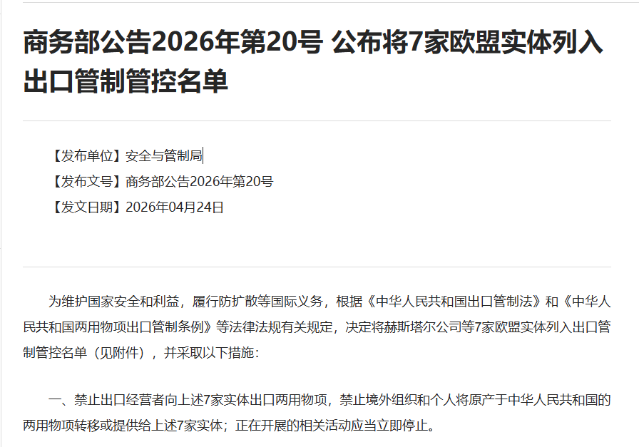 为维护国家安全和利益,履行防扩散等国际义务,根据《中华人民共和国出口管制法》和《中华人民共和国两用物项出口管制条例》等法律法规有关规定,决定将赫斯塔尔公司等7家欧盟实体列入出口管制管控名单(见附件),并采取以下措施: