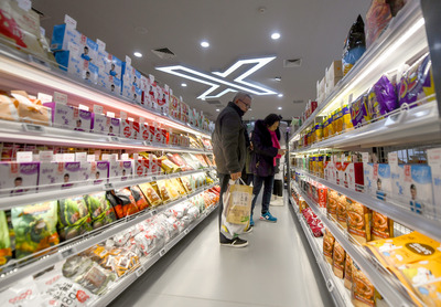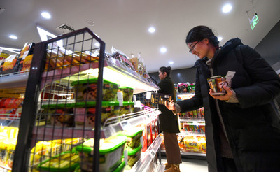 1月18日,顾客在超市内选购商品。当日,京东无人超市在天津生态城开张纳客,成为京东在华北地区首批社会化运营的无人超市。超市面积约170平方米,有食品、饮料、日用百货等800多种商品,通过利用物联网、人工智能、生物识别等多项技术,帮助顾客实现全程自助无人购物。 新华社记者白禹摄