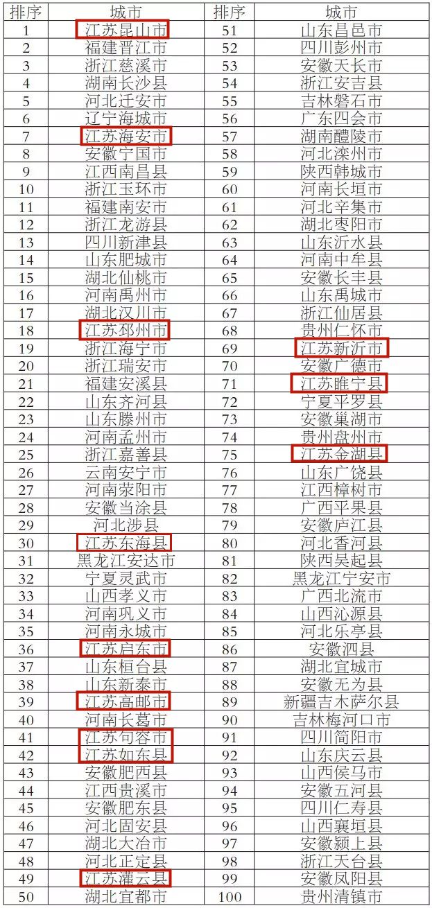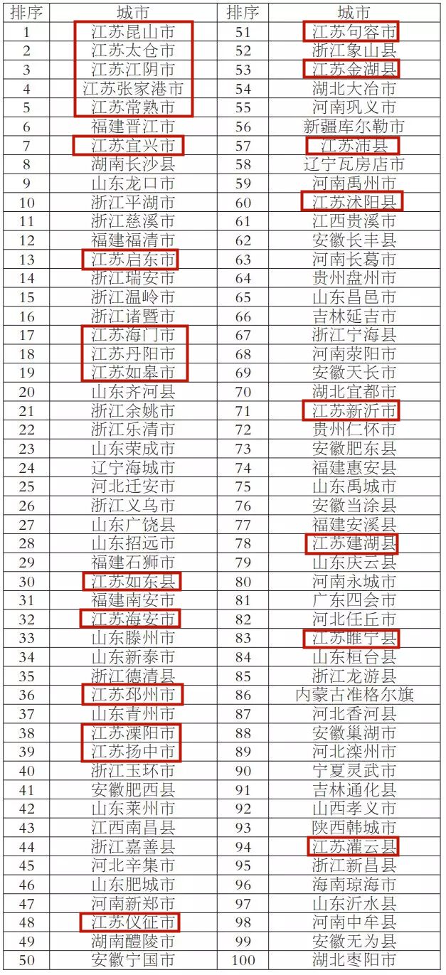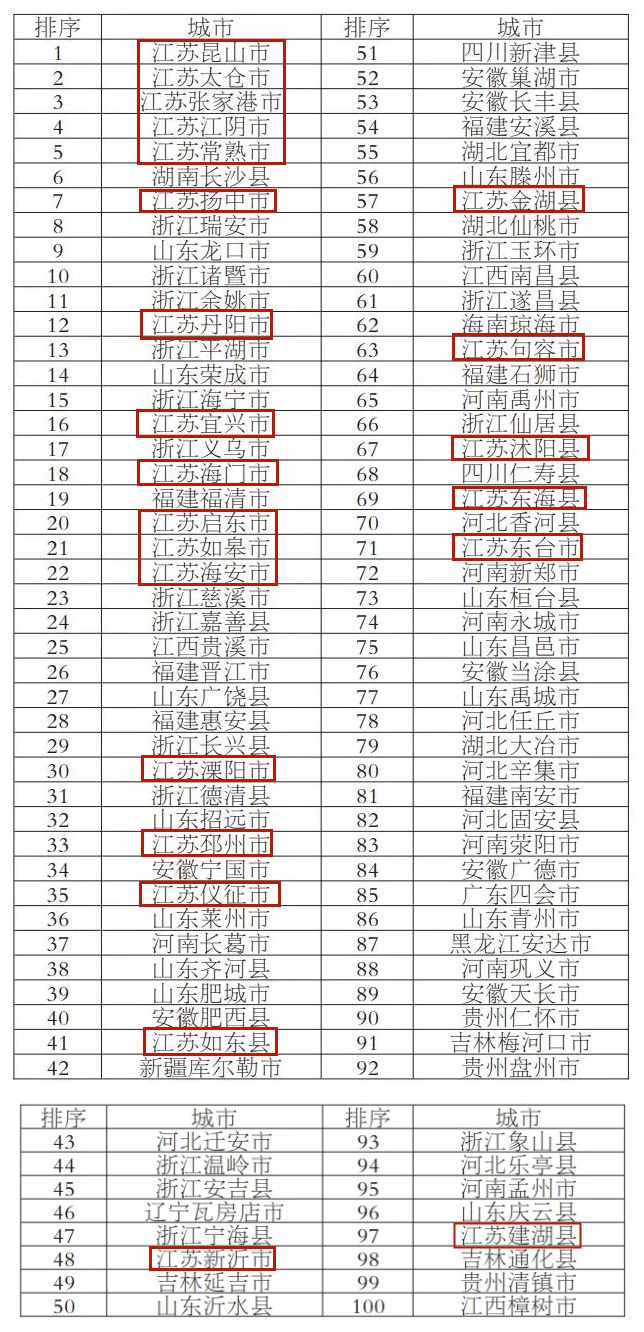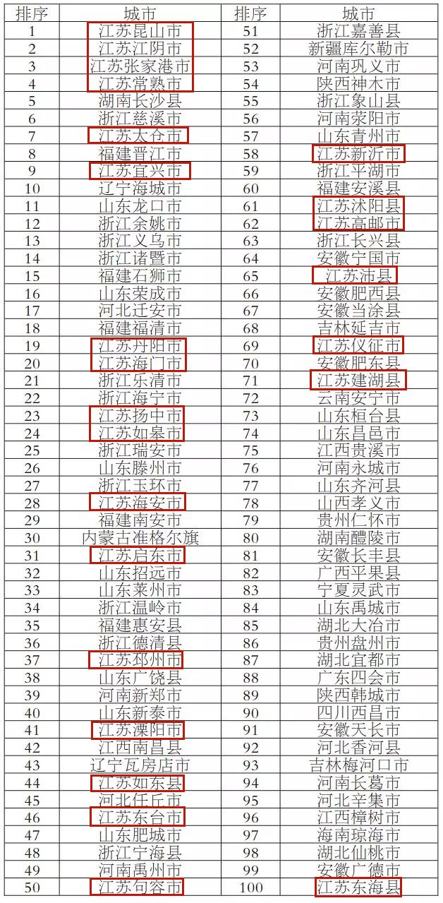 江苏共有24个县市入围全国综合实力百强县市,入围数全国第一。江苏昆山不出意料地夺得榜首,这是昆山连续15年卫冕该榜首。“百强县”的前四名被江苏昆山、江阴、张家港、常熟包揽,太仓和宜兴分别位居百强榜的第7名和第9名。也就是说,“百强县”前十名中,江苏就占据其六。这6个县市都分布在苏州、无锡两大经济发达的苏南城市。