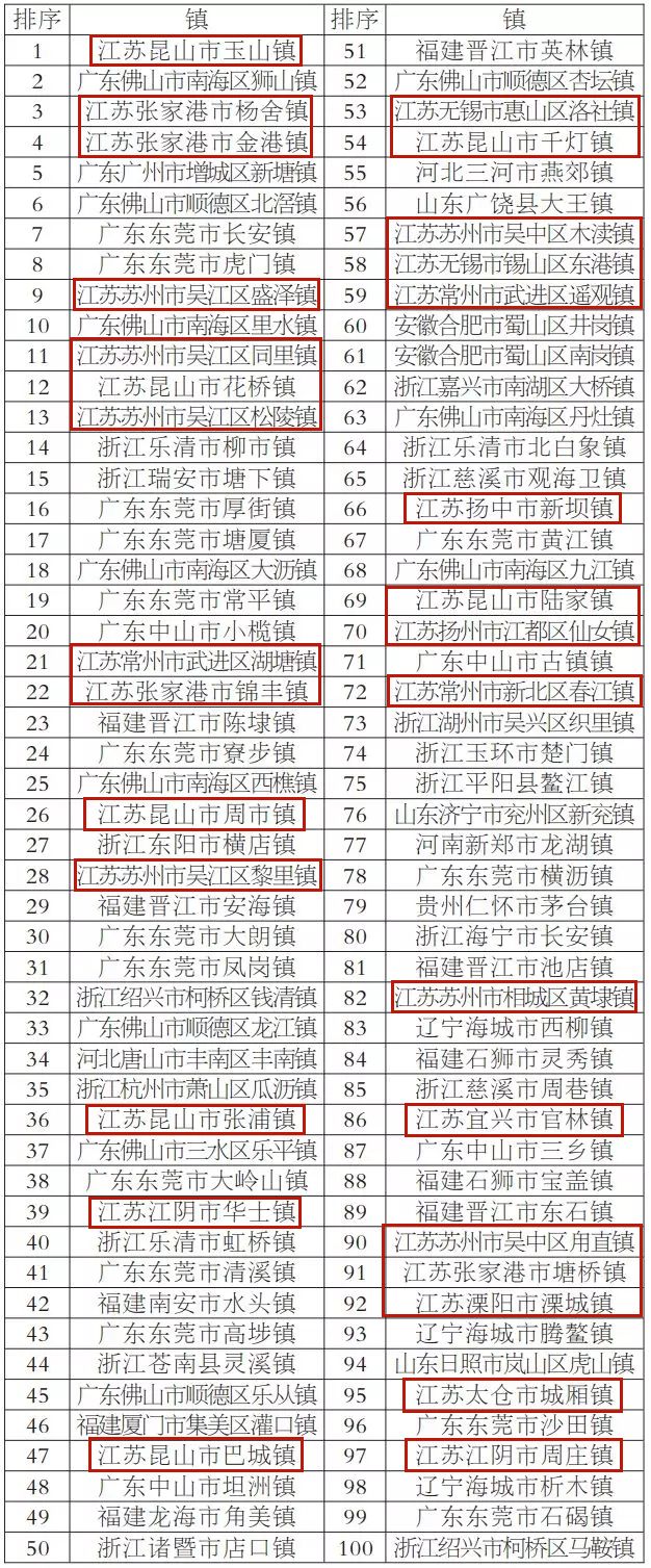 江苏30个镇入围2019年度全国综合实力千强镇前100名,前10名江苏有4个。
