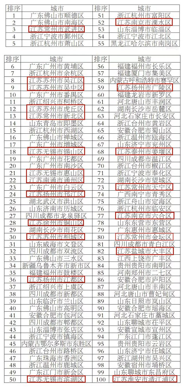 江苏有21个区入围全国综合实力百强区,其中,常州武进区、苏州吴江区、吴中区位列前十。