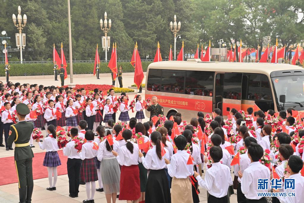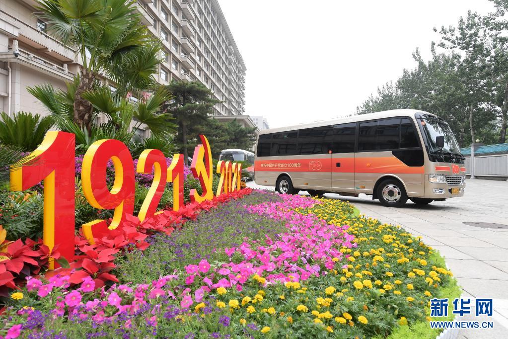 6月29日,庆祝中国共产党成立100周年“七一勋章”颁授仪式在北京人民大会堂金色大厅隆重举行。这是“七一勋章”获得者集体乘坐礼宾车从住地出发,前往人民大会堂。新华社记者 李贺 摄