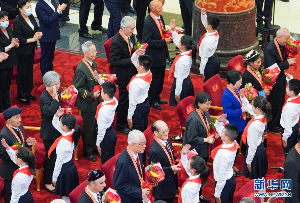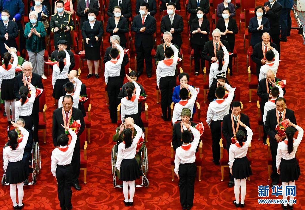 6月29日,庆祝中国共产党成立100周年“七一勋章”颁授仪式在北京人民大会堂金色大厅隆重举行。这是少先队员向勋章获得者献花,敬礼致意。新华社记者 高洁 摄