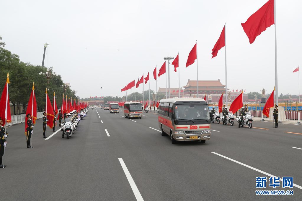 6月29日,庆祝中国共产党成立100周年“七一勋章”颁授仪式在北京人民大会堂金色大厅隆重举行。这是“七一勋章”获得者集体乘坐礼宾车,由国宾护卫队护卫前往人民大会堂。新华社记者 丁海涛 摄