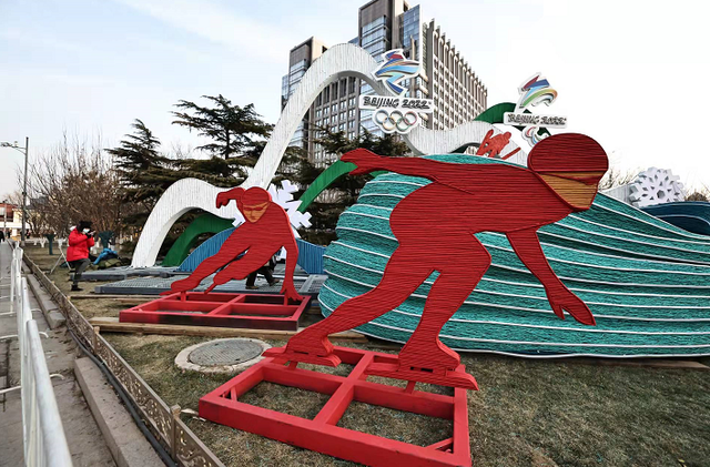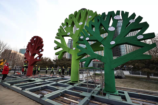 花坛顶高8米,以冬奥会会徽、海坨戴雪、冰丝带、运动员等造型为主景,描绘出一幅生机盎然的绿色冰雪画卷,体现“绿色”冬奥铺就了美丽的中国底色。