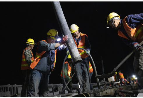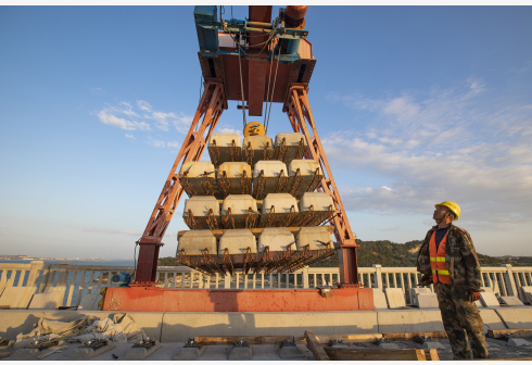 4月8日,工人在新建福厦铁路湄洲湾跨海大桥施工。4月9日,由中铁十一局承建的新建福厦铁路湄洲湾跨海大桥无砟轨道施工完成,为后续铺轨贯通和通车运营创造了有利条件。新建福厦铁路湄洲湾跨海大桥位于福建省莆田市及泉州市境内,全长14.7公里,其中海域施工长度10.8公里。 新华社发(周义摄)