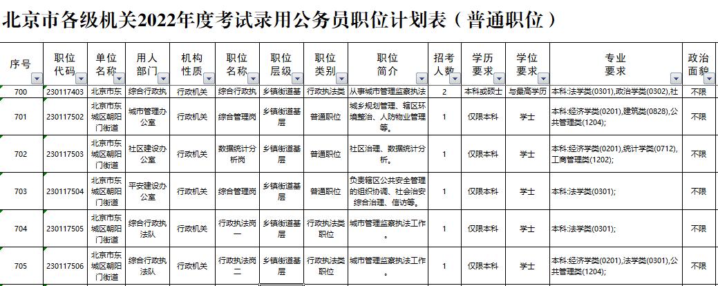 北京市各级机关2022年度考试录用公务员职位计划表(普通职位)部分截图。