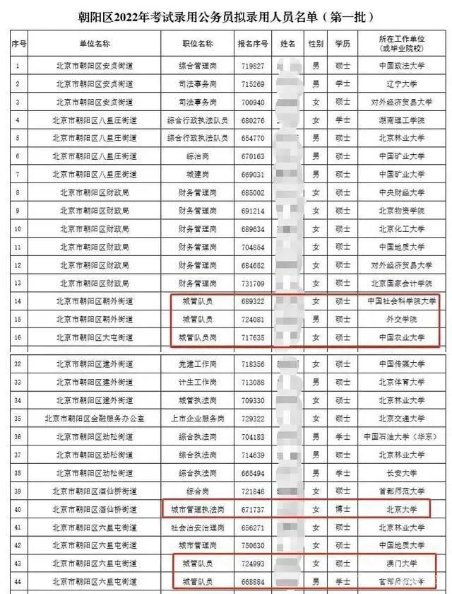 近日,北京市朝阳区公布的2022年考试录用公务员拟录用人员名单引起关注。据公示名单显示,本次拟录用的人员全都取得了学士或学士以上学历,甚至有多名拟录用人员还是双学士或硕士、博士等学位,而他们被录用的单位涉及部分政府部门及街道,岗位则包括城管、党群工作岗位等。