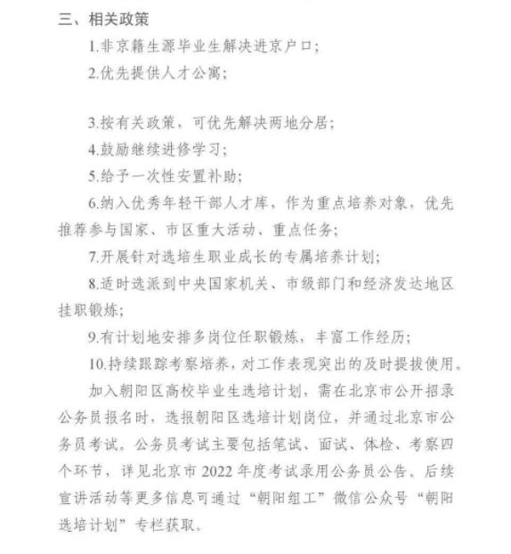 而据朝阳区组织部消息,为优化朝阳区公务员队伍结构,发现和选拔一批优秀高校毕业生到朝阳区各机关工作,北京市朝阳区自2018年以来,已实施了三届“选培计划”。该选培计划的招考程序与普通公务员招录相同,目前共招录了200余名来自北大、清华、人大等院校的优秀应届毕业生进入“选培计划”队伍。而该计划也为相关人员提供了十条政策,包括为非京籍生源毕业生解决进京户口;优先提供人才公寓;优先解决两地分居;纳入优秀年轻干部人才库,优先推荐参与国家、市区重大活动、重点任务等。