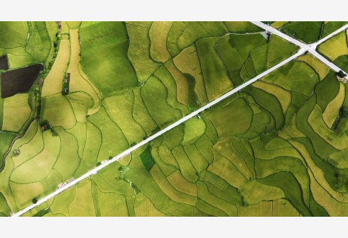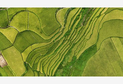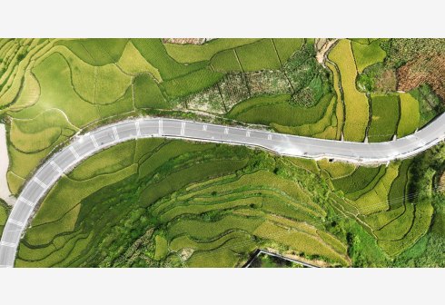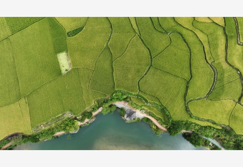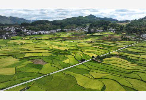 8月27日拍摄的贵州省贵阳市开阳县禾丰乡马头村田园景色(无人机照片)。初秋,贵州省贵阳市开阳县禾丰乡马头村近千亩优质稻谷长势喜人,田园、村庄、河流、乡村公路组成一幅贵州高原独特的田园丰收画卷。 新华社记者 杨楹 摄