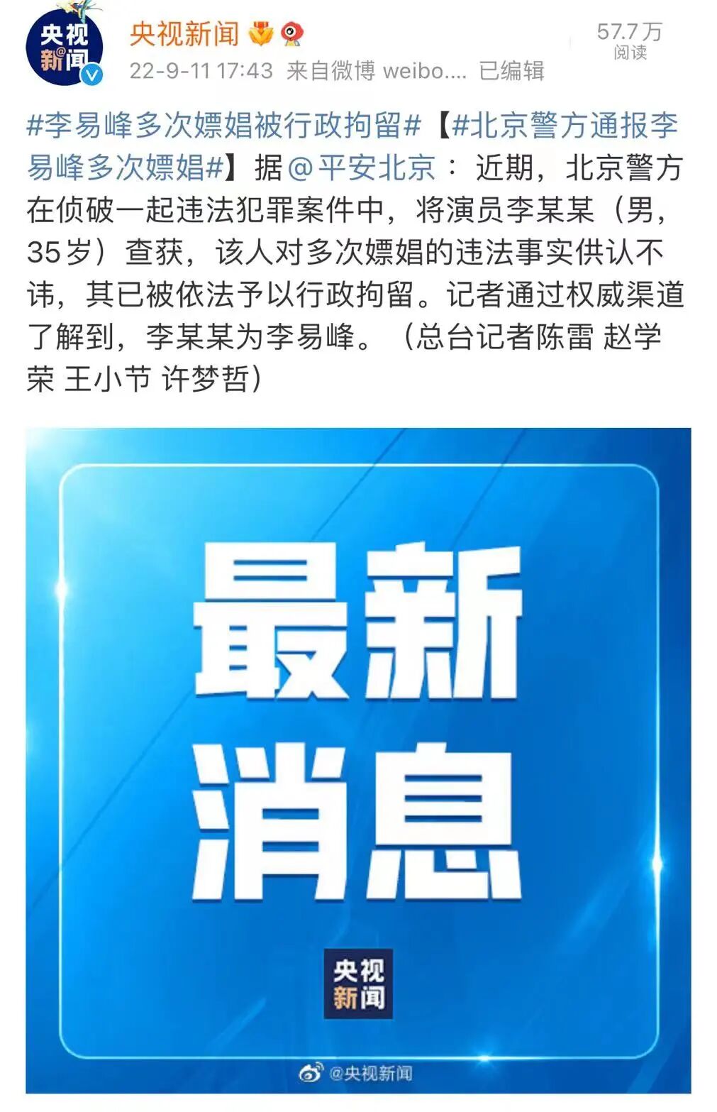 央视记者通过权威渠道了解到,李某某为李易峰。