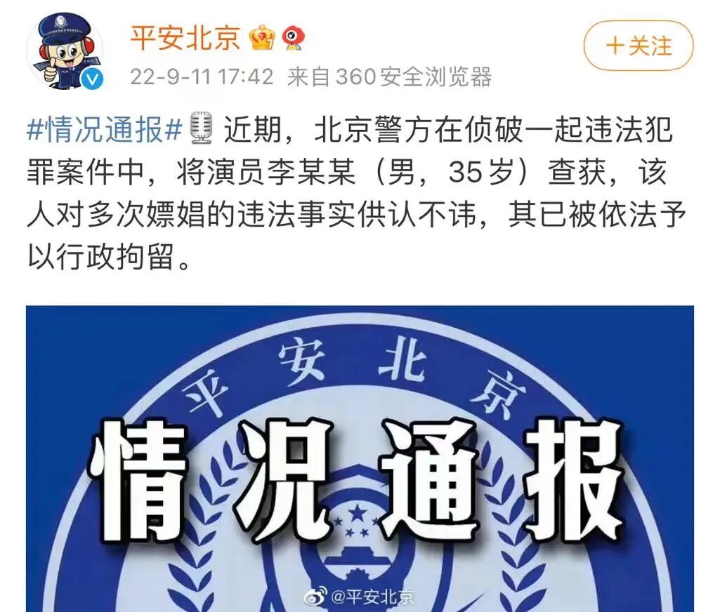 近期,北京警方在侦破一起违法犯罪案件中,将演员李某某(男,35岁)查获,该人对多次嫖娼的违法事实供认不讳,其已被依法予以行政拘留。