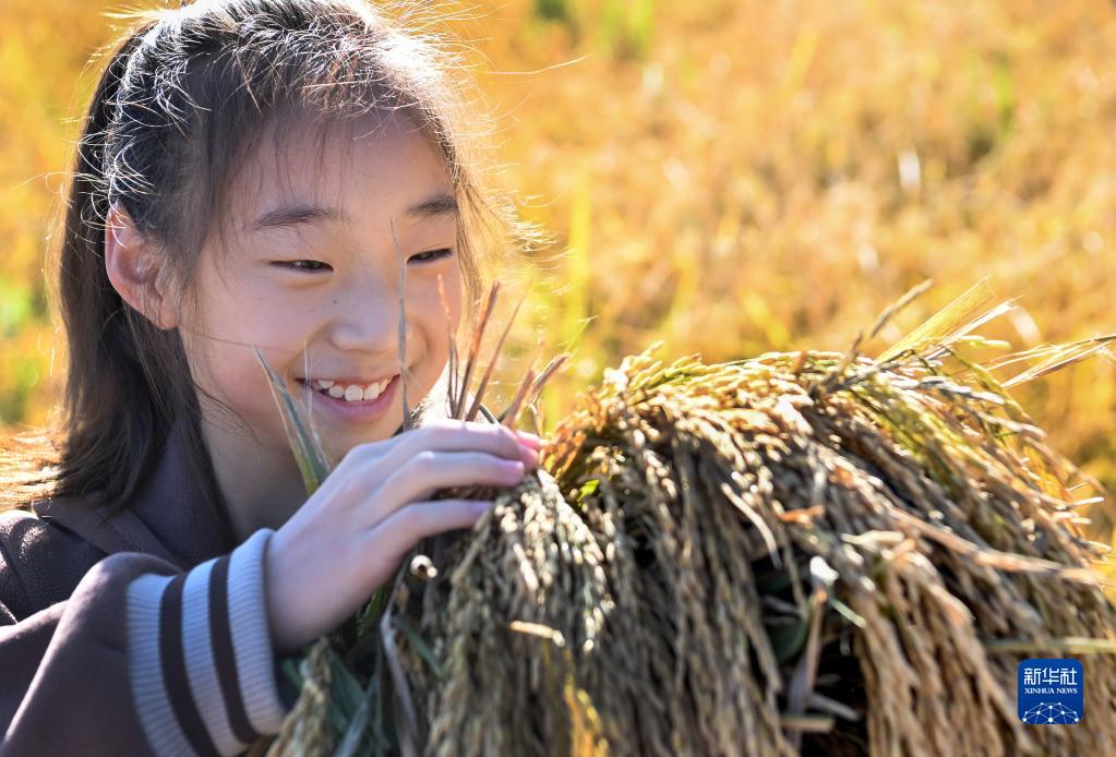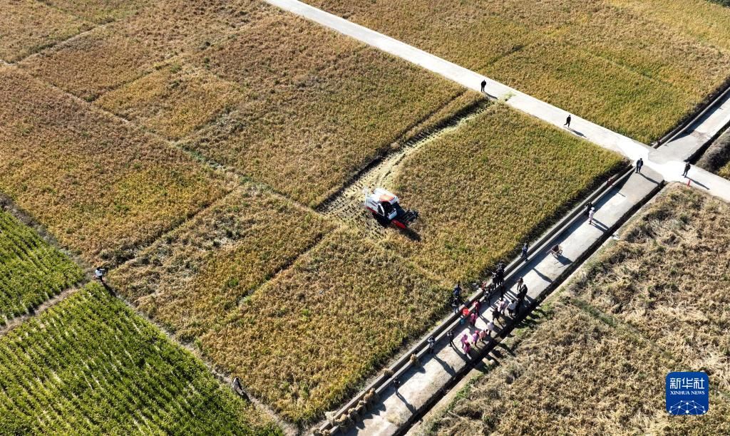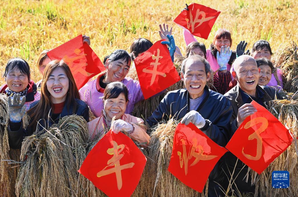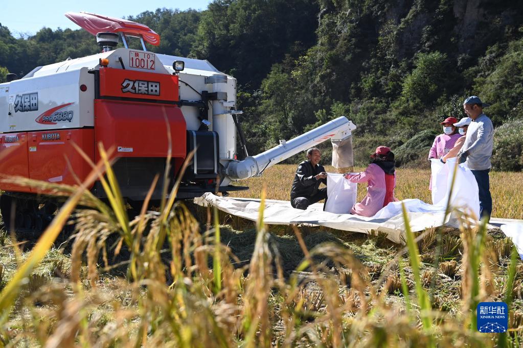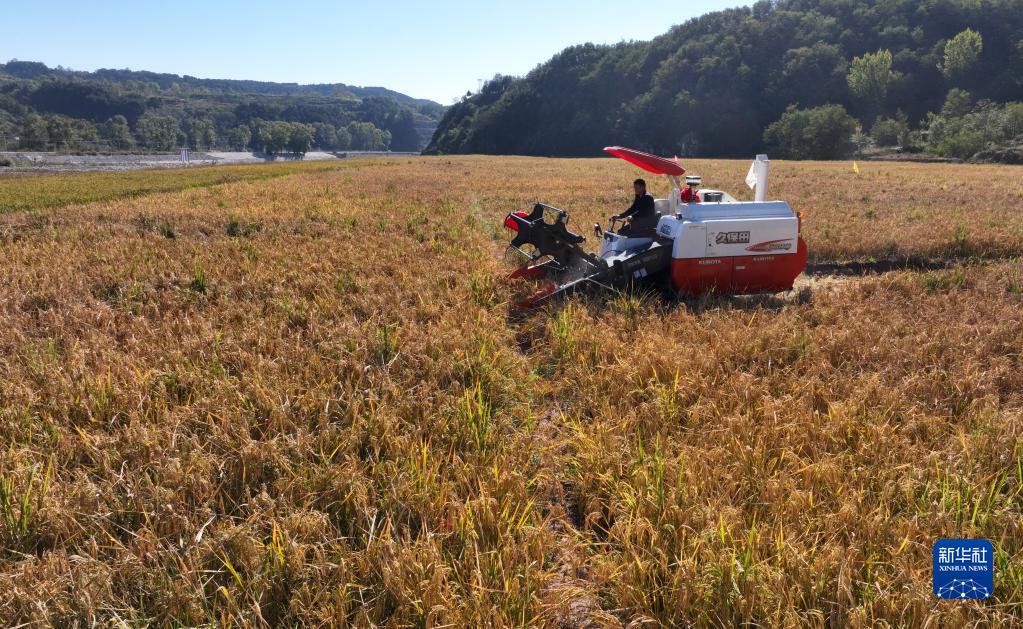 10月11日,群众在水稻开镰仪式上。 当日,苏陕协作项目陕西省洛南县旱改水水稻种植示范园培育种植的150亩优良水稻开始收割。 南京市江宁区和陕西省洛南县合作,充分发挥江宁区科技力量,优化水稻品种,精心选育繁育,聘请农业专家对水稻的育苗、日常管理、施肥、病虫防治等方面进行讲解指导,先后引进明香粳813和徐粳119等新品种水稻进行试种。今年试种成功并喜获丰收,亩产达600公斤,打破了地处秦岭深处的商洛全市多年不种水稻的历史。 水稻种植的引进将有利于秦岭深山农业种植结构的调整,并将通过大面积推广,助力农民增收,推进乡村振兴。 新华社记者 陶明 摄